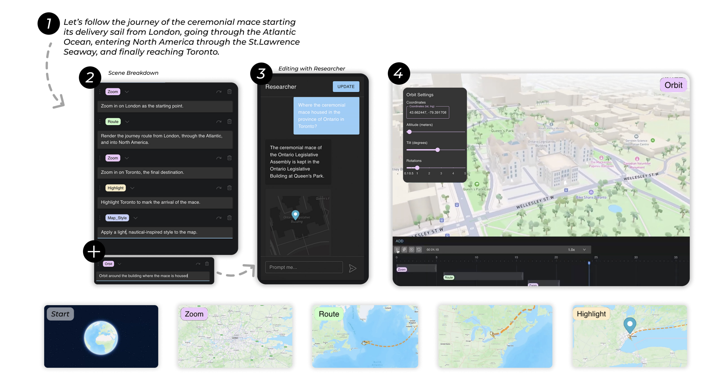 The structured commands are compiled into a full animation specification with keyframe timings, camera paths, and synchronized visual elements. Everything renders on a live map canvas.